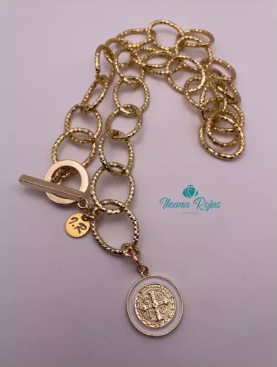 Eslabones dorados en forma ovalada con un hermoso dije de San Benito y cierre en baño .