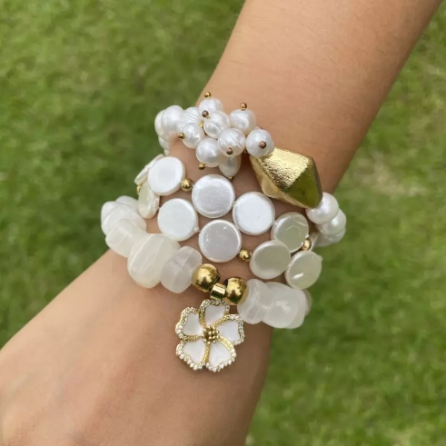 Hermoso juego muy básico, cáscajos con flor concha de nácar, Perlas planas , Perlas con separador en baño de oro y empinada .