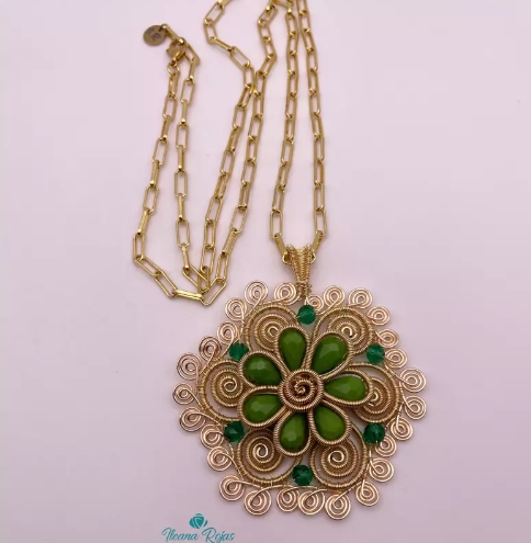 Cadena en aluminio, dije en alambrismo de 6cms , muy básico ideal para camiseras , vestidos o ropa casual.