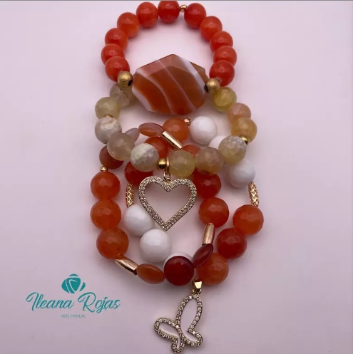 Hermosas pulseras en tonos naranjas con ágatas, jades , dijes , separadores en baño de oro. Adquiéralas en individuales o en juego .