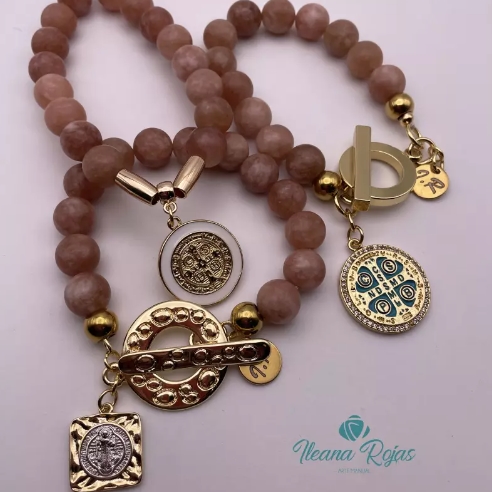 Gemas con dije en concha de nácar blanco, Medalla turquesa, Medalla dorada